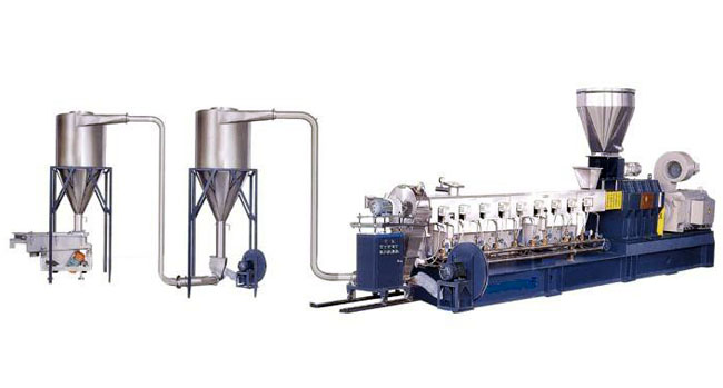 木塑造粒系統(tǒng)由雙螺桿擠出機(jī)、熱切造粒機(jī)、三級(jí)風(fēng)等幾部分送組成。