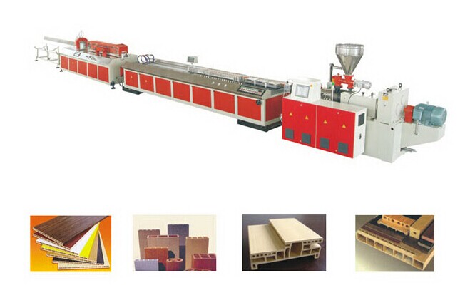 該生產(chǎn)線采用特殊設(shè)計的螺桿、料桶、模具及加工生產(chǎn)工藝并配 備型材輔機,即可生產(chǎn)PE、PP或PVC木塑異型材制品。